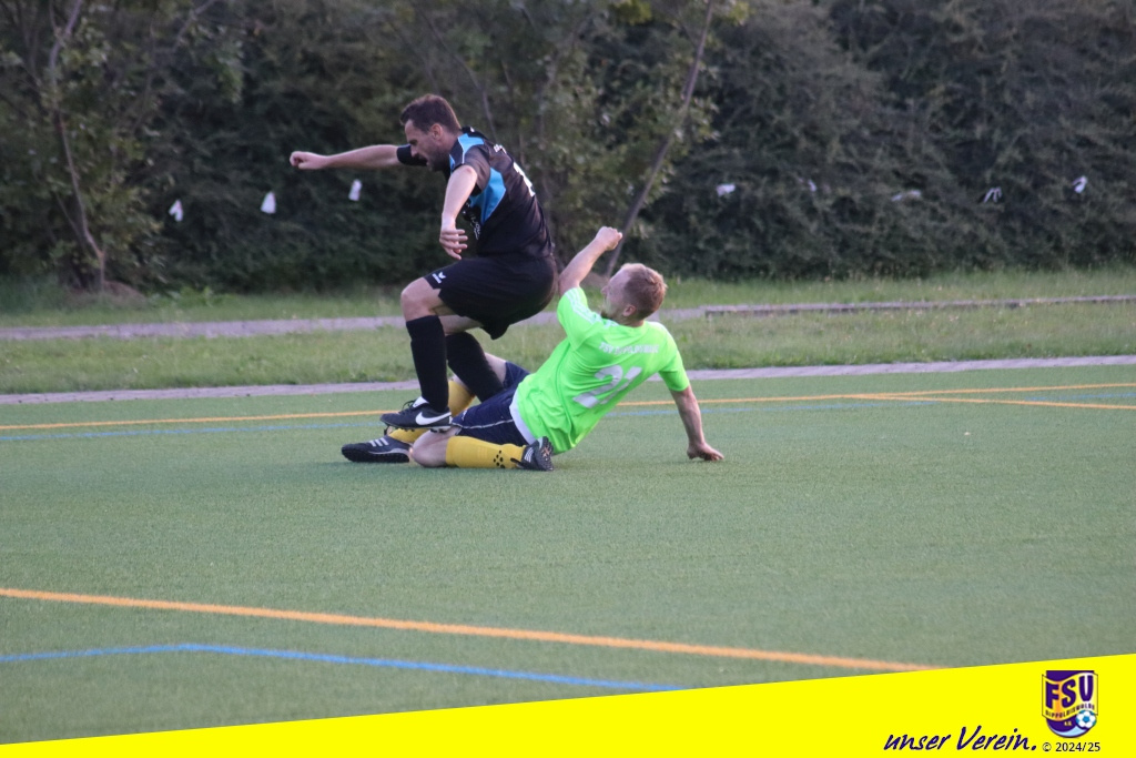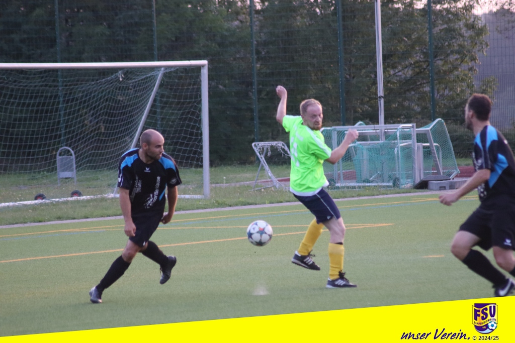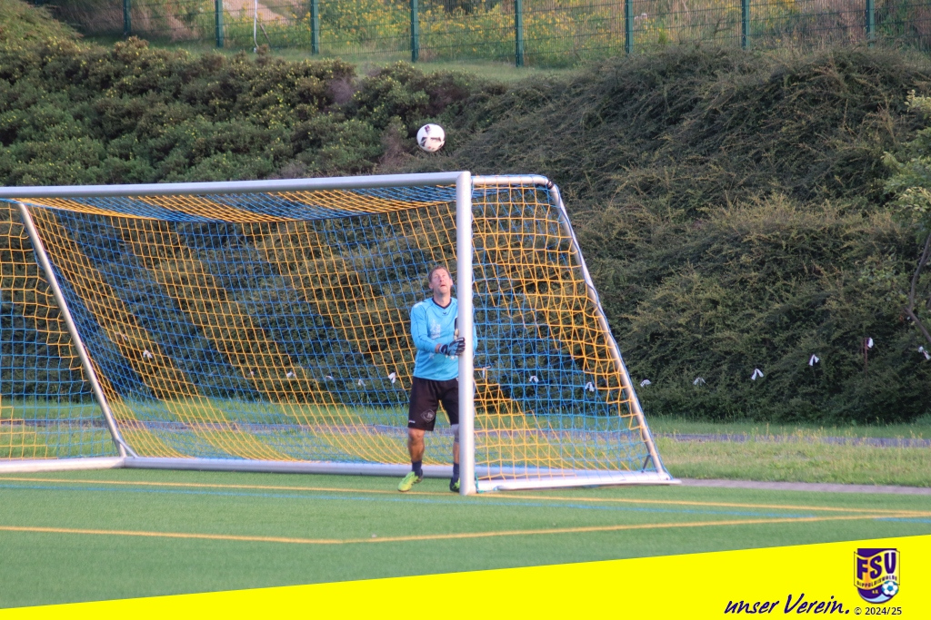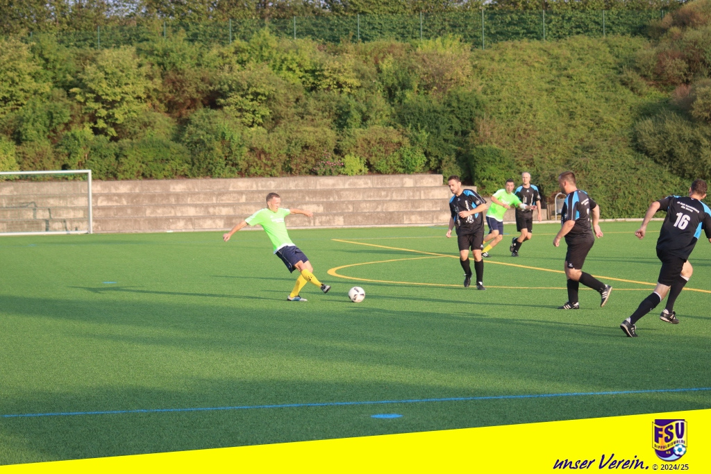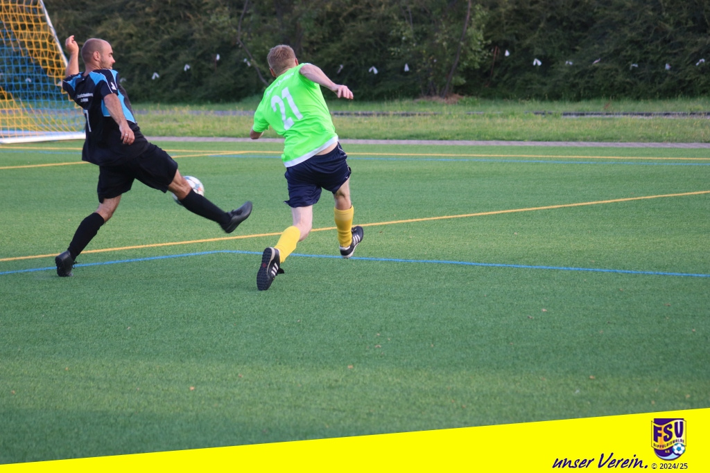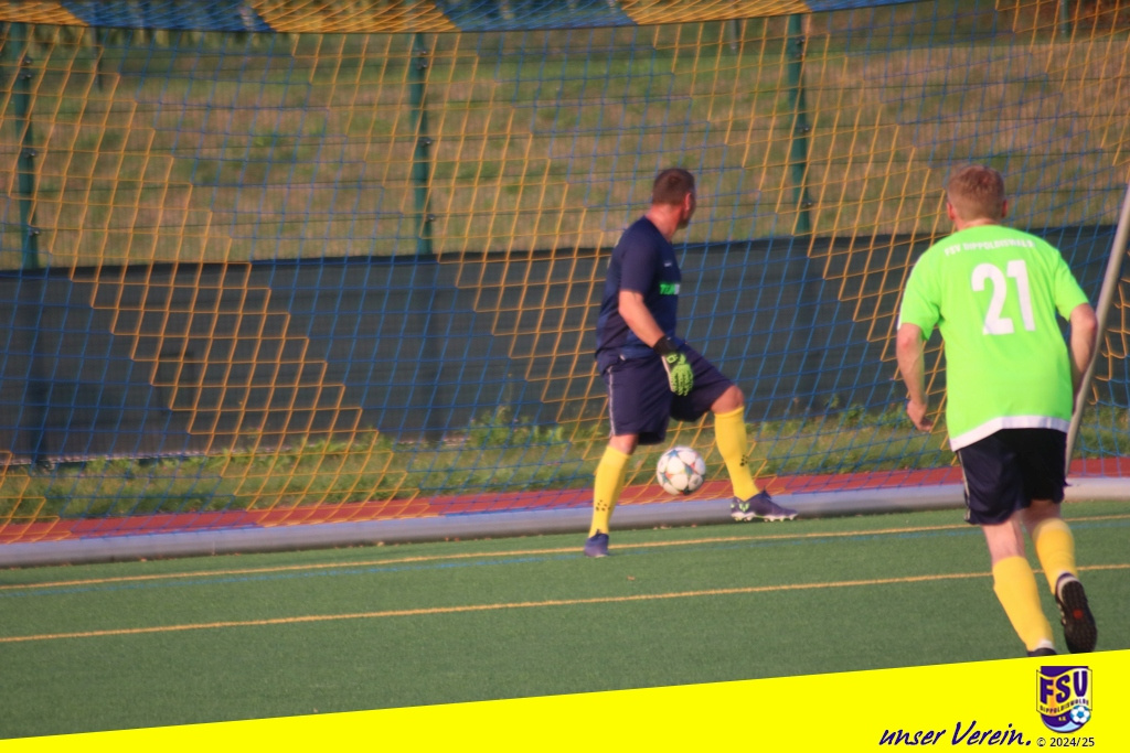 Bei immer noch hochsommerlichen Temperaturen bemühten sich beide Teams von Anfang an um Spielkontrolle und Ballbesitz, um möglichst gut mit den Energieressourcen haushalten zu können. Die Stahlkicker machten dabei zunächst den besseren Eindruck. Erste Chancen wurden aber von der FSV-Hintermannschaft um Nibby und Gietz und falls notwendig auch vom in die Bresche gesprungenen Ersatzkeeper Michi gut wegverteidigt, wenn auch manchmal etwas glücklich. Unser eigenes Offensivspiel kam aber irgendwie noch nicht so richtig in die Gänge. Wir suchten oft zu schnell, für ein AH-Spiel eh untypisch, den direkten Weg nach vorn. Nach etwa einer halben Stunde kam Gietz bei einem Klärungsversuch im 16er gerade noch rechtzeitig, … oder doch nicht? Das wurde zumindest kontrovers diskutiert. Egal, der umsichtig leitende Schiri Viktor Balaz zeigte resolut auf den Punkt und der bereitstehende Schmiedeberger Schütze verwandelte halbwegs sicher in die Tormitte. Unsere Bemühungen um eine schnelle Ergebniskorrektur wurden von der Stahl-Hintermannschaft zuvorkommend unterstützt. Matti nutzte eine Unaufmerksamkeit und überlupfte den gegnerischen Keeper gekonnt. Mit dem Remis ging es in die Pause.